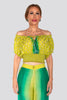 Playful and dainty, the Karissa crop top effortlessly translates from casual to formal settings. Designed using 100% hand cut silk, ombre dyed using dip technique on reversed jacquard loom weave. Showcasing a boat-neck with adjustable drawstring, finished off with our PAUL ROPP trademark hand beaded detail. Enhanced by shirred top and bottom border and a cinched elastic sleeve for the perfect fit on each individual body.